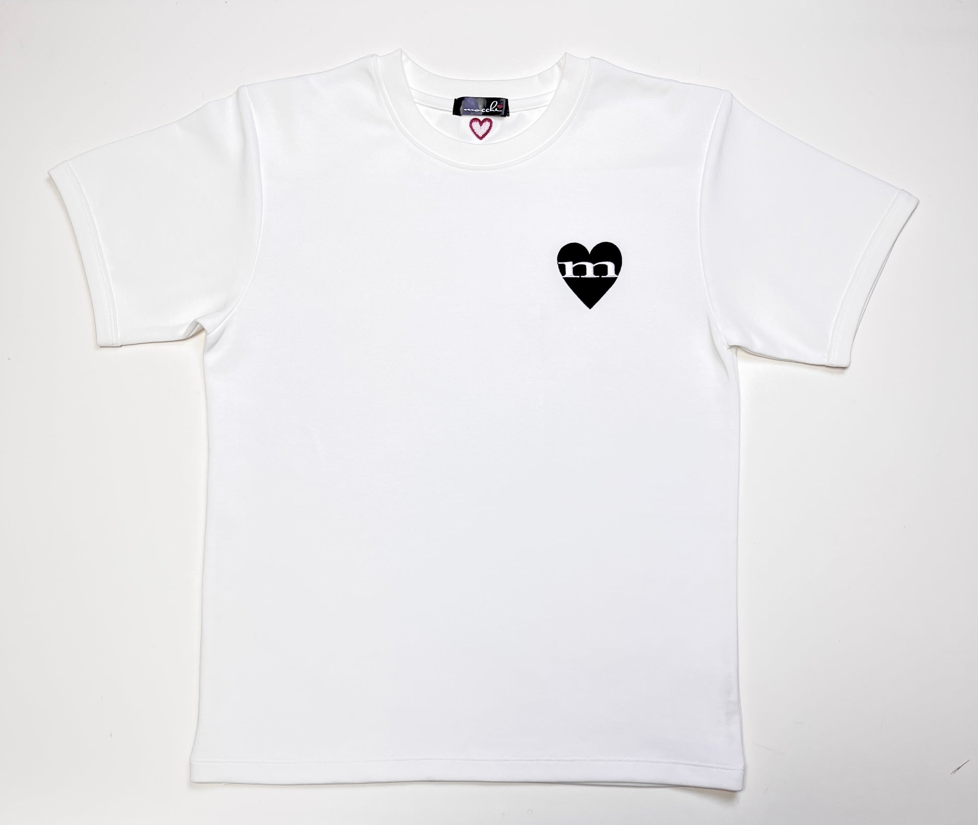 Front: 胸元にはハートの中にブランドのmマークの刺繍。一枚で着てもサマになる、可愛らしい印象を与えます。