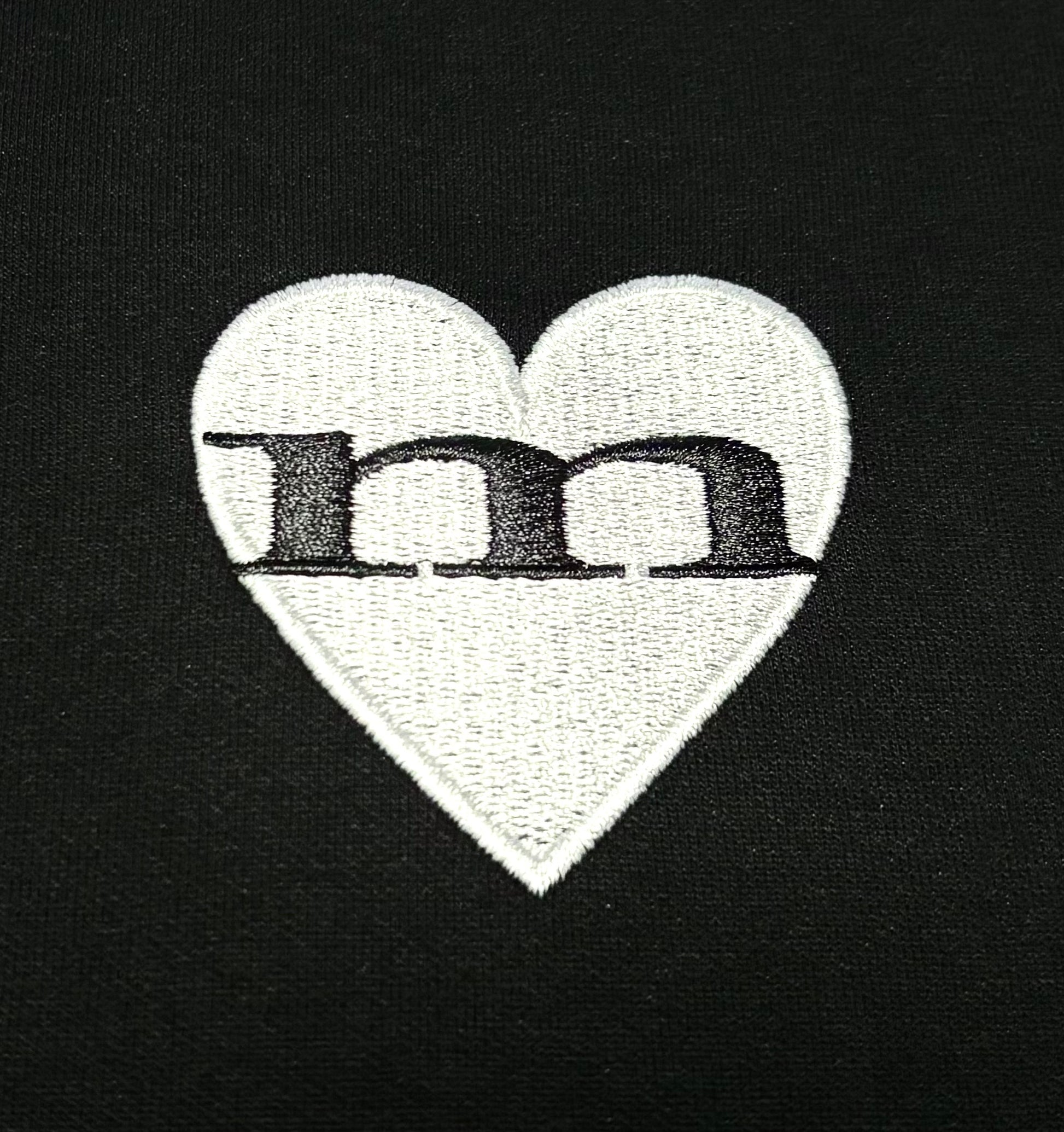 Front: 胸元にはハートの中にブランドのmマークの刺繍。一枚で着てもサマになる、可愛らしい印象を与えます。